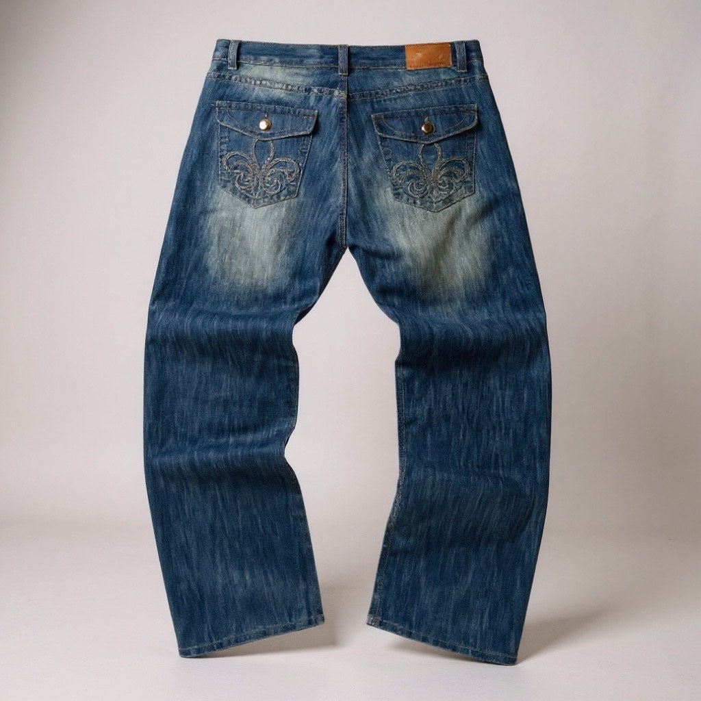 Coupe droite ample typique des années 2000, surpiqûres épaisses et broderies fleur de lys signature au dos.