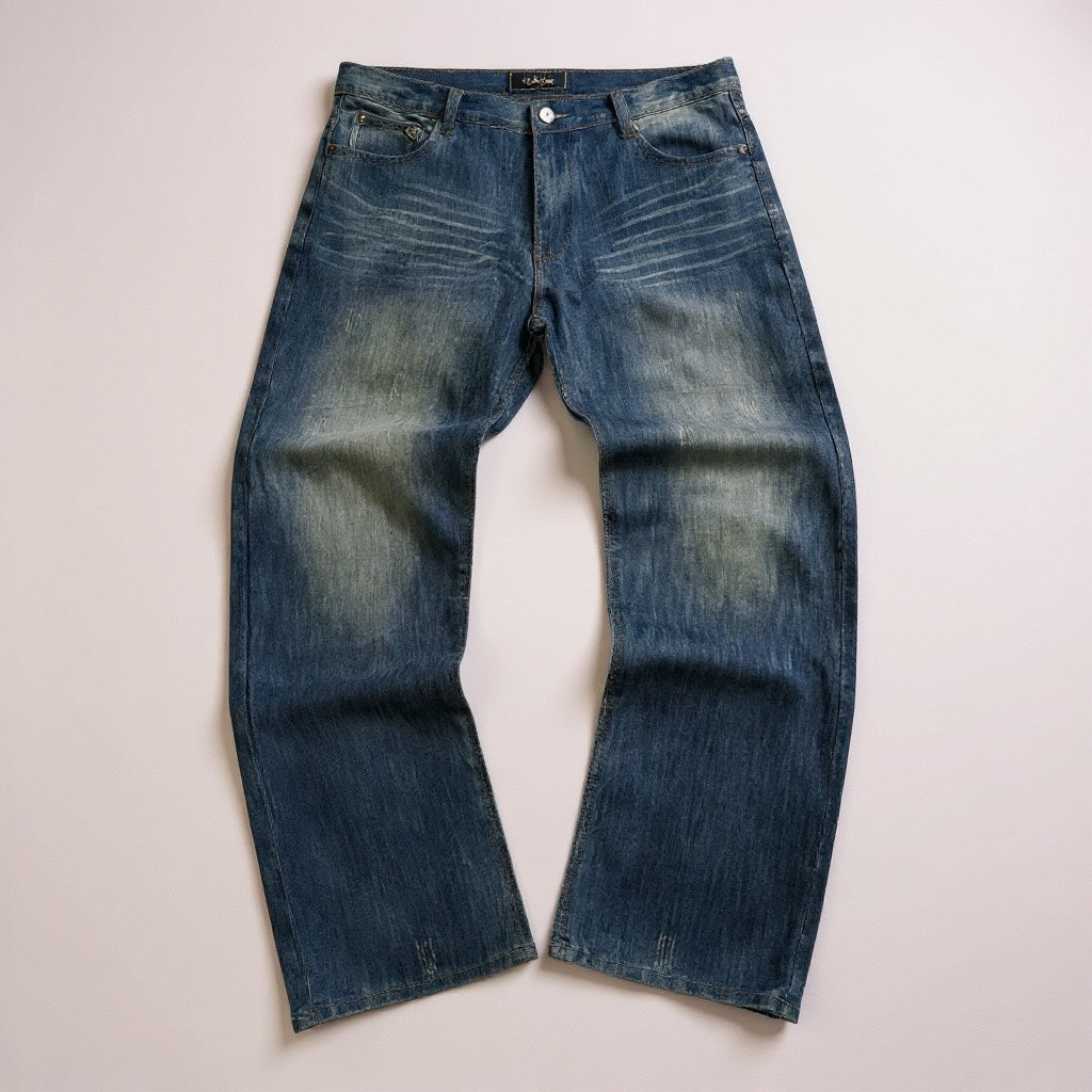 Jean Halifax vintage au délavage clair, avec une patine naturelle et des effets d’usure authentiques.