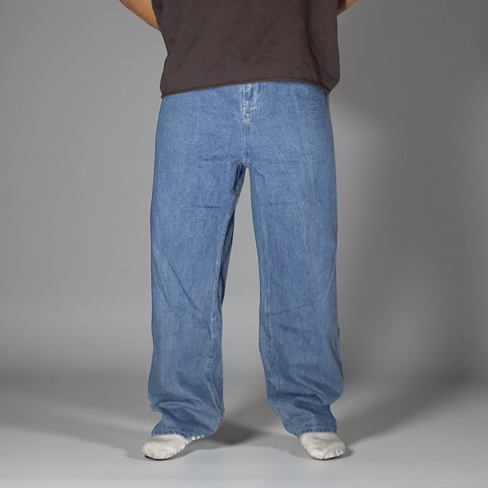 Coupe baggy droite, denim bleu vieilli et patchs brodés style graffiti et dragons dans le dos.