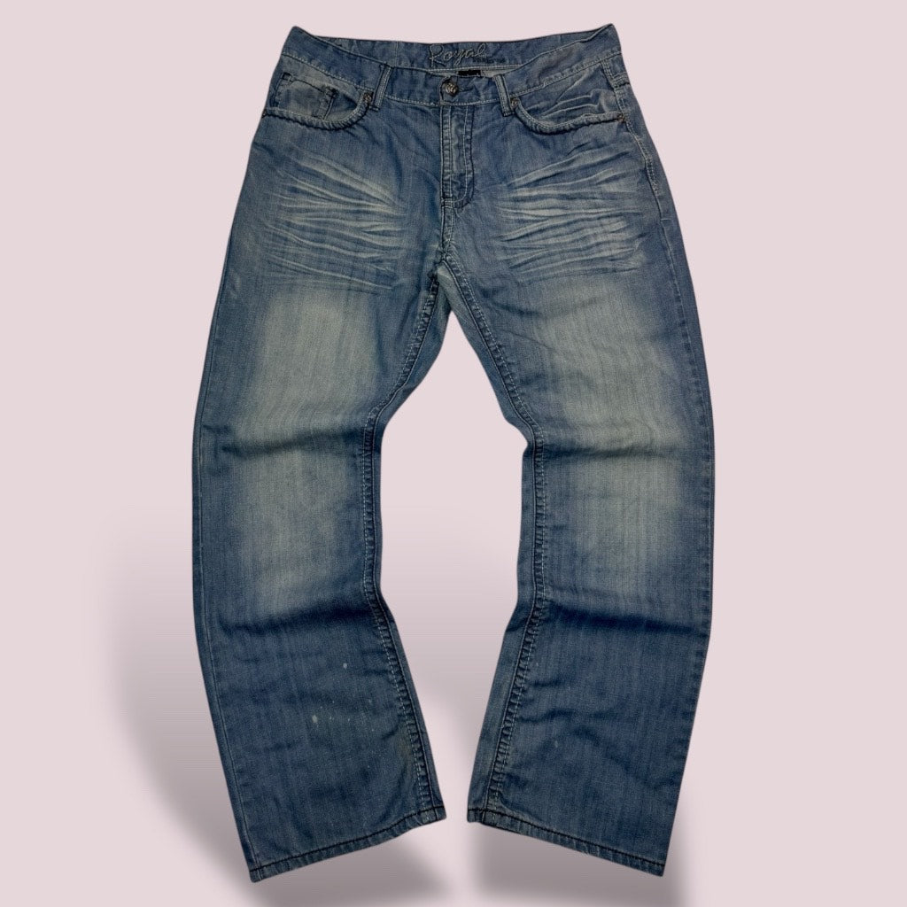 Jean Royal Premium au style vintage Y2K avec un délavage bleu moyen et des coutures décoratives épaisses typiques des années 2000.
