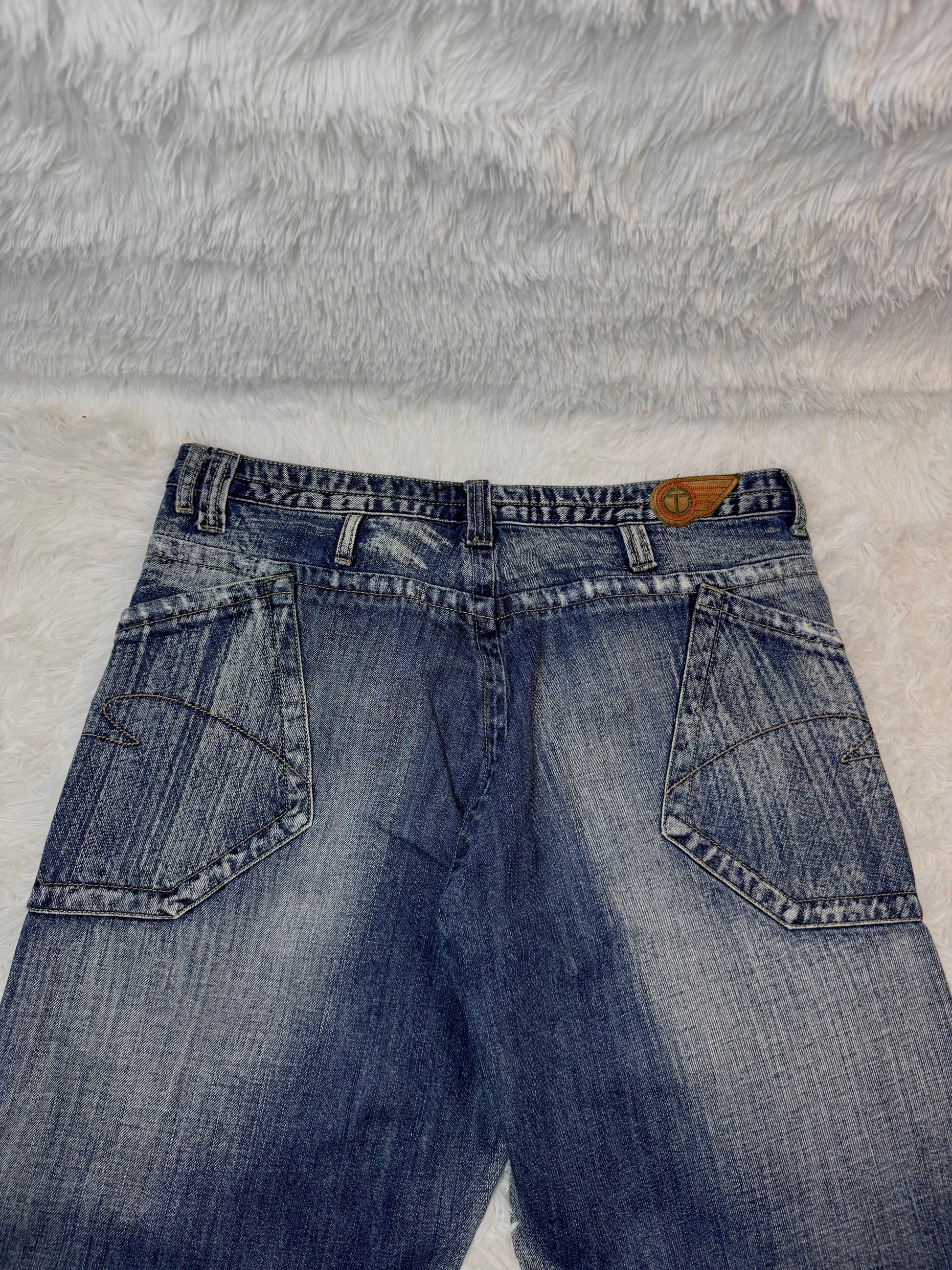 Jean TNK Jeans (Tank Corporation), emblématique du style Y2K / années 2000, avec son denim bleu clair délavé, ses détails géométriques sur les poches avant et sa coupe baggy droite ultra stylée.